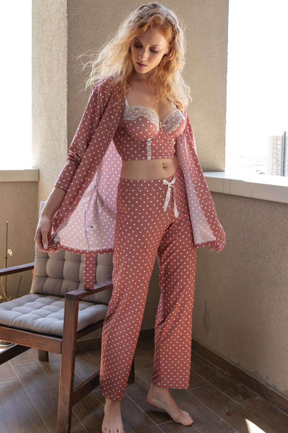 Anıl Viskon Puantiyeli Sabahlık Balenli Destekli Dolgulu Dantelli Büstiyer Sütyen ve Pantolon Pijama 3'lü Takım (5605)